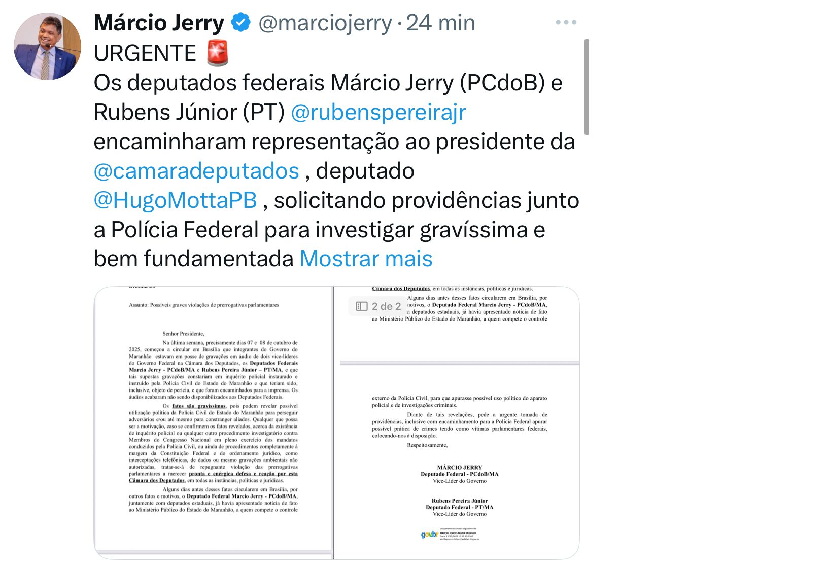 Os deputados também lembram que, dias antes da repercussão das supostas gravações, Márcio Jerry já havia apresentado uma notícia de fato ao Ministério Público do Maranhão, solicitando investigação sobre o possível uso político do aparato policial estadual. Agora, na nova representação conjunta, os parlamentares pedem que o caso seja encaminhado à Polícia Federal para apuração de eventual prática de crimes tendo como vítimas parlamentares federais.