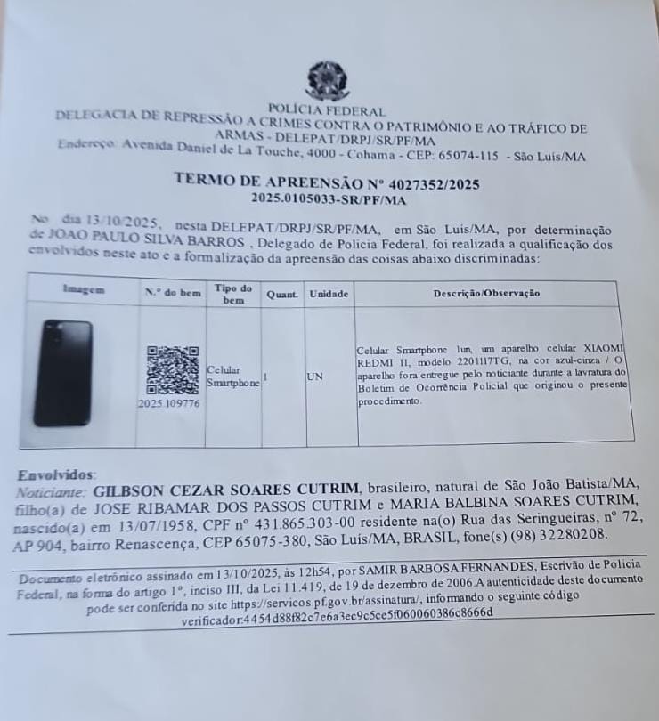 Na última segunda feira a Polícia Federal por determinação do Delegado João Paulo da Silva Barros apreendeu o celular pertencente a Cesar Soares Cutrim, que é pai do assassino confesso do caso do Tech Office, Gilbson Soares Cutrim Junior, removido recentemente para um presídio em Brasília com a federalização do caso.