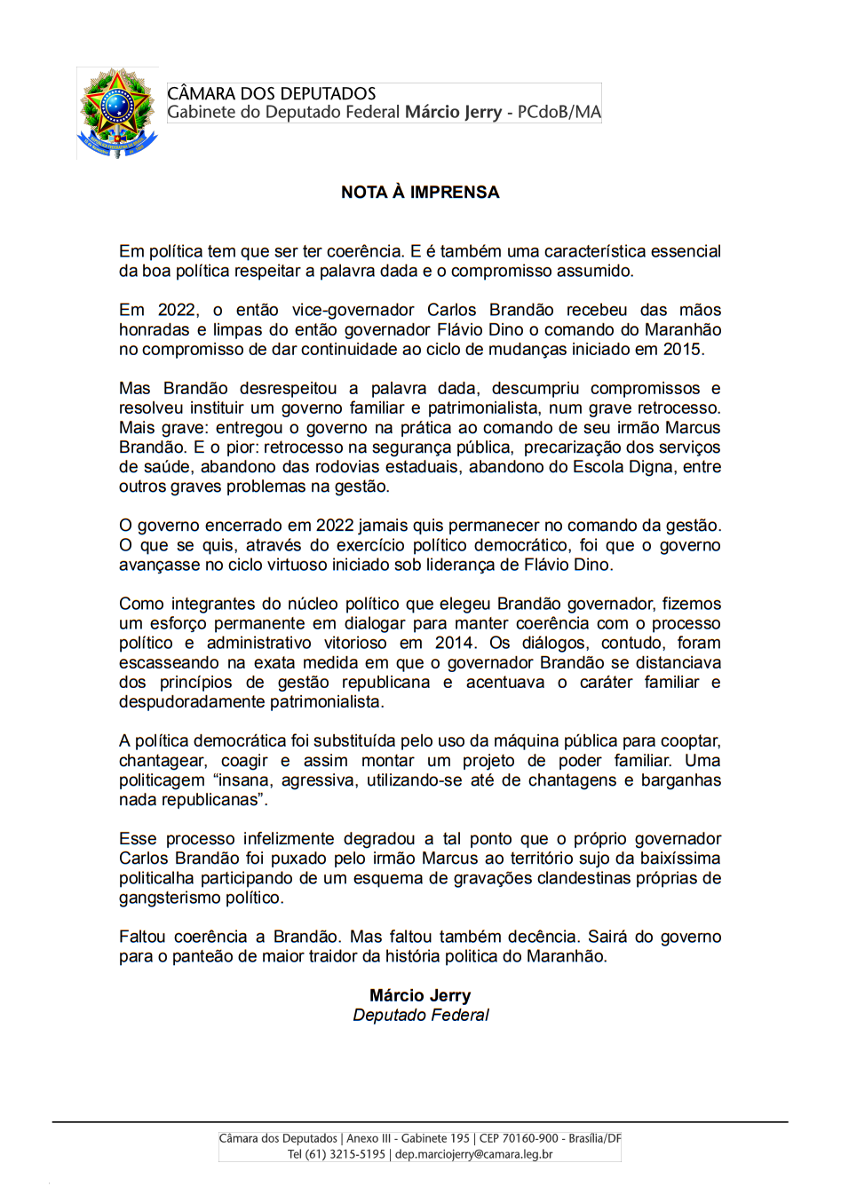 Na nota divulgada no fim da tarde desta quarta-feira, Márcio Jerry acusa o governador de ter “desrespeitado a palavra dada, descumprido compromissos e resolvido instituir um governo familiar e patrimonialista, num grave retrocesso”, ao entregar “o governo, na prática, ao comando de seu irmão Marcus Brandão”. O documento também cita “retrocesso na segurança pública, precarização dos serviços de saúde, abandono das rodovias estaduais e do programa Escola Digna”.