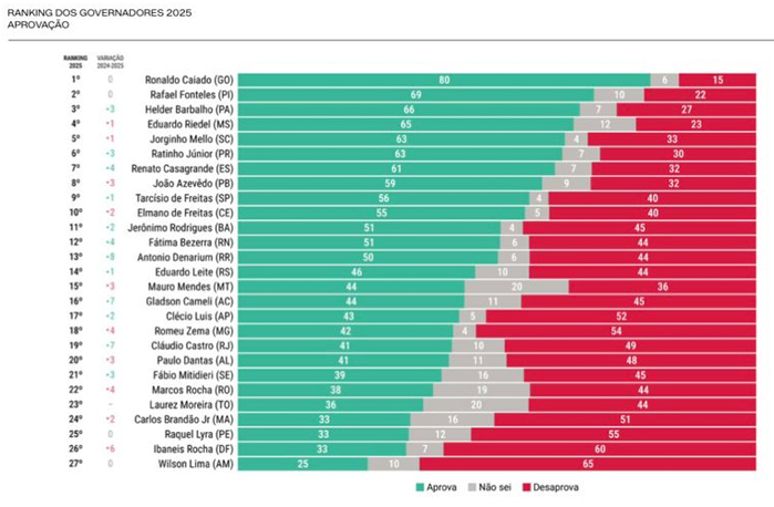 O governador com o maior índice de aprovação foi Ronaldo Caiado (União-GO) com 80% de aprovação.